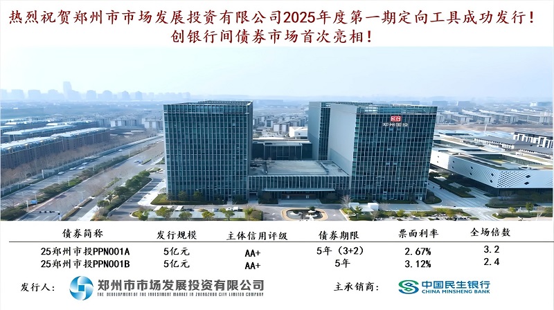 近日,鄭州市市場發(fā)展投資有限公司(以下簡稱“鄭州市投”,外部主體評(píng)級(jí)AA+)成功發(fā)行2025年度第一期定向債務(wù)融資工具,進(jìn)一步優(yōu)化了公司融資結(jié)構(gòu)。本期債券由民生銀行擔(dān)任主承銷商,發(fā)行總規(guī)模10億元,創(chuàng)新采用“3+2年”(票面利率2.67%)與“5年”(票面利率3.12%)雙期限結(jié)構(gòu),創(chuàng)下近期同期限、同評(píng)級(jí)企業(yè)信用債首發(fā)利率較低水平,顯示出資本市場對(duì)鄭州國企發(fā)展前景的高度認(rèn)可。